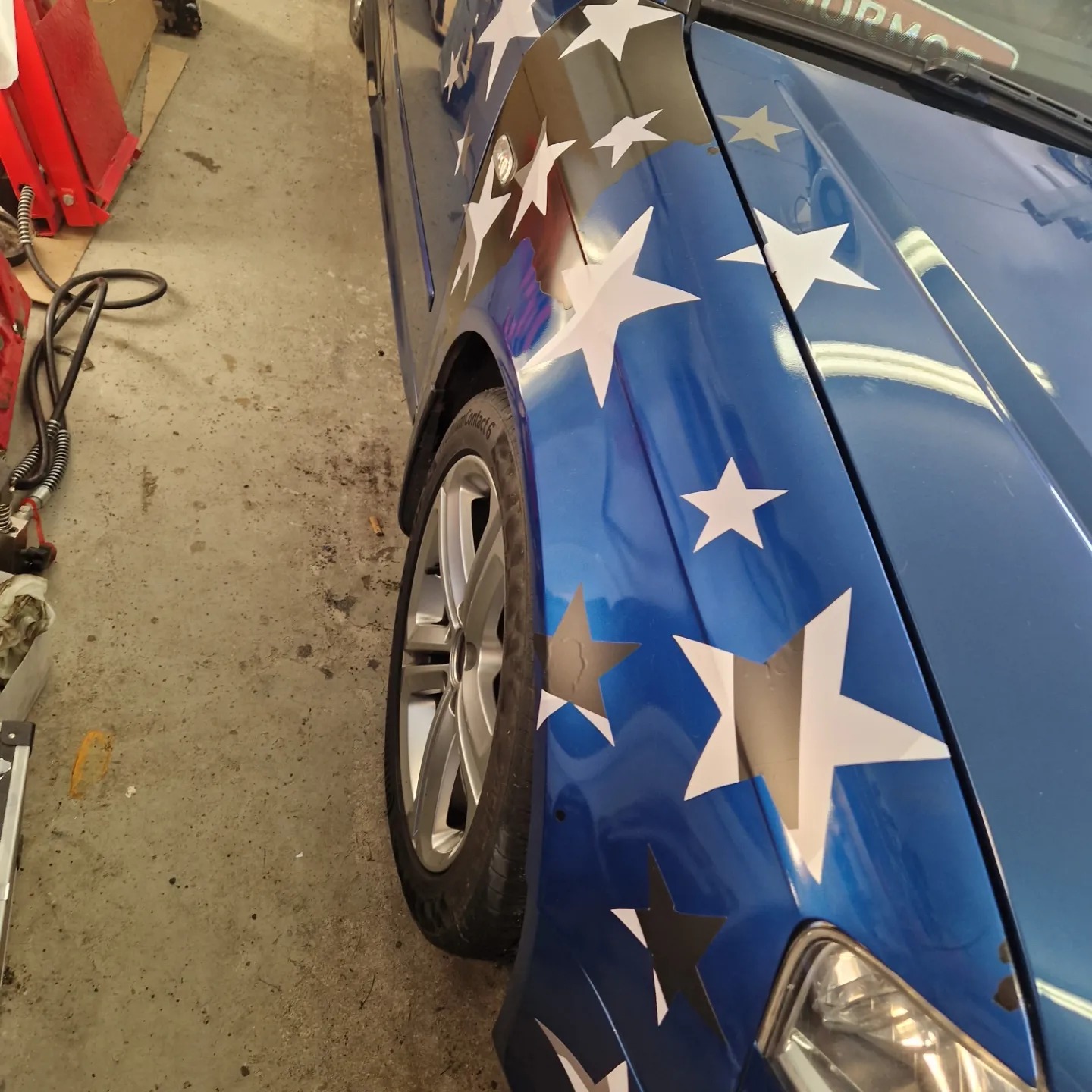 Stjärnorna på skärmen är en nödlösning bara! Ingen fränfaktor igenteligen, men jag har bytt skärm, huv och front efter en krock med en polisbil förra hösten och han som skulle lacka om detta bangade ur, så jag gjorde det själv, men underarbetet på skärmen var under all kritik, så färgen lossnade igen :D